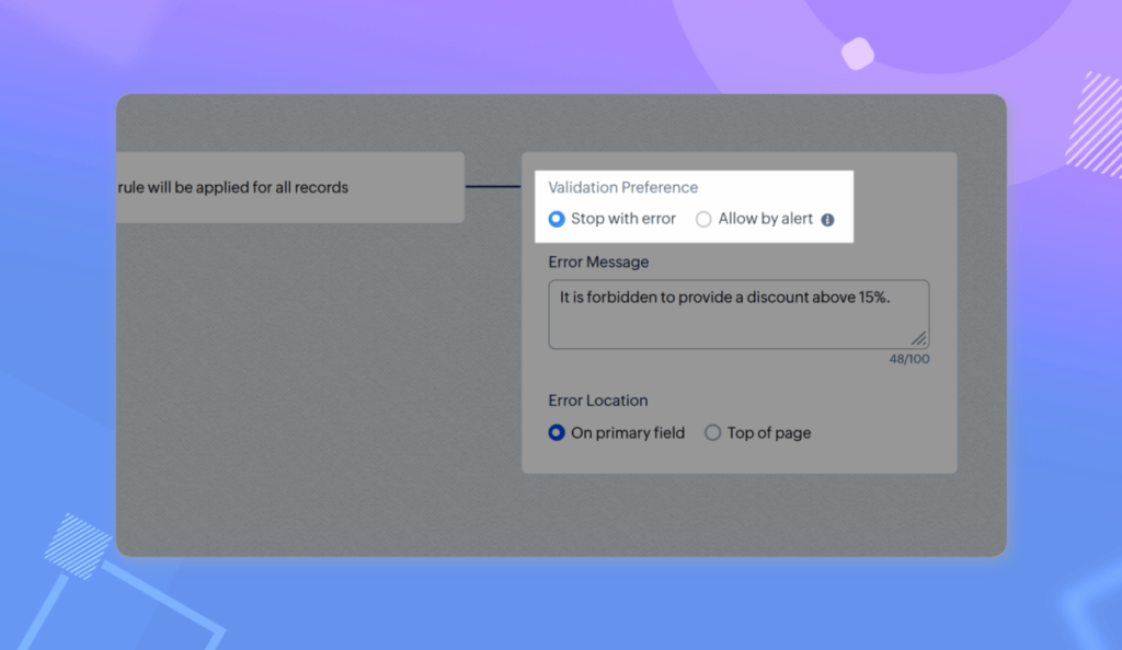 When you choose to stop with an error, the record will not be saved with the entered value. This feature is beneficial for completely blocking the input of inaccurate data. Before this enhancement, this was the default behavior of all validation rules.