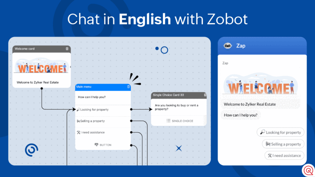 Imagine a welcome message followed by branching options – Zobot will respond based on the chosen option. This initial flow can be built in a default language and then deployed on your website or on any channel.